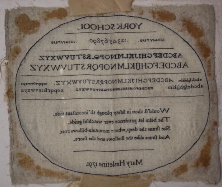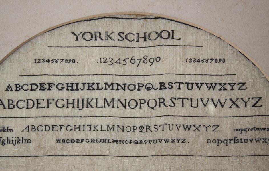 Oval cross-stitch sampler, worked in black thread on fine linen, with 'York School' above various Arabic numerals and alphabets, with 4-line stanza below, and the maker's name and date to lower margin, all within a stitched oval border, scattered small holes, occasionally just touching embroidery, 25.3 x 30.3cm (10 x 12ins), oval mount, |