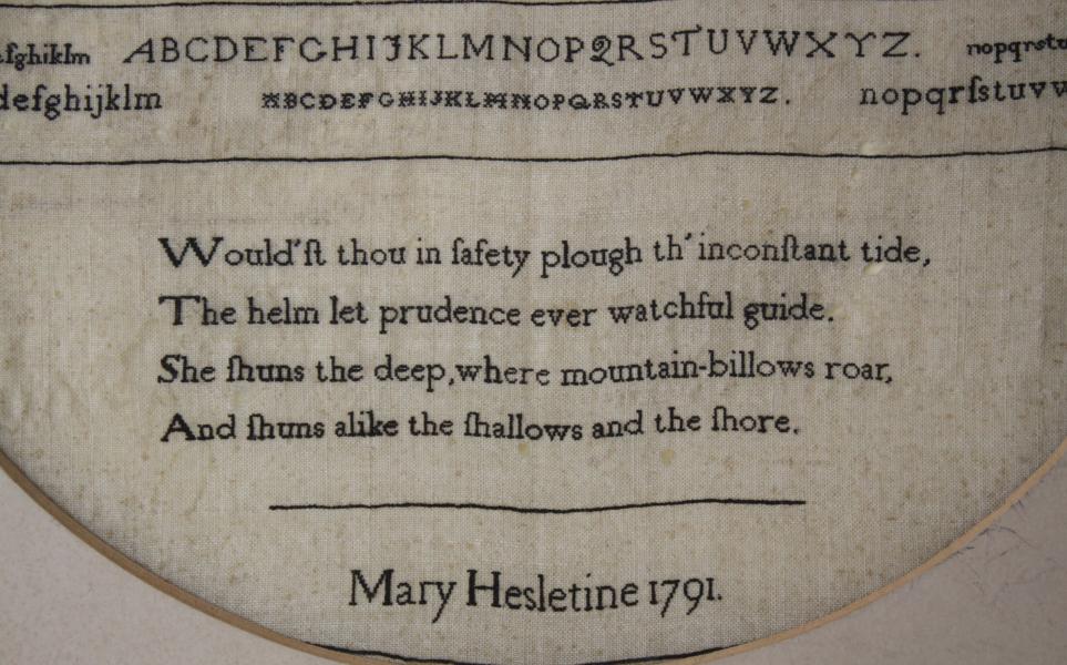 Rare early Quaker sampler. York School, or York Friends' Girls' School, to give it its full name, opened in 1785. Its founders were prominent Quakers, Esther and William Tuke, who wished to provide an education for the daughters of fellow Quakers. Fees were 14 guineas a year for ‘instruction, board and washing’. The school continues today as an all-girls educational establishment, now known as The Mount School. The verse reads: 'Would'st thou in safety plough th' inconstant tide,The helm let prudence ever watchful guide.She shuns the deep, where mountain-billows roar.And shuns alike the shallows and the shore.' It is the first part of a 12-line poem published in Miscellanies, Moral and Instructive, in Prose and Verse; collected from various authors, for the use of schools, and improvement of young persons of both sexes, compiled by American Quaker poet Milcah Martha Moore (1740-1829). It was first published in Philadelphia in 1787, and re-printed in London the same year.