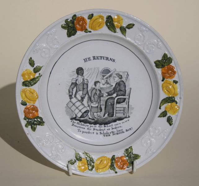 Really interesting image on this Childs plate , att.to Clews circa 1820 "HE RETURNS" The Holidays past the school once more, receives the student as before; To perfect in Scholastic-lore The School Boy.