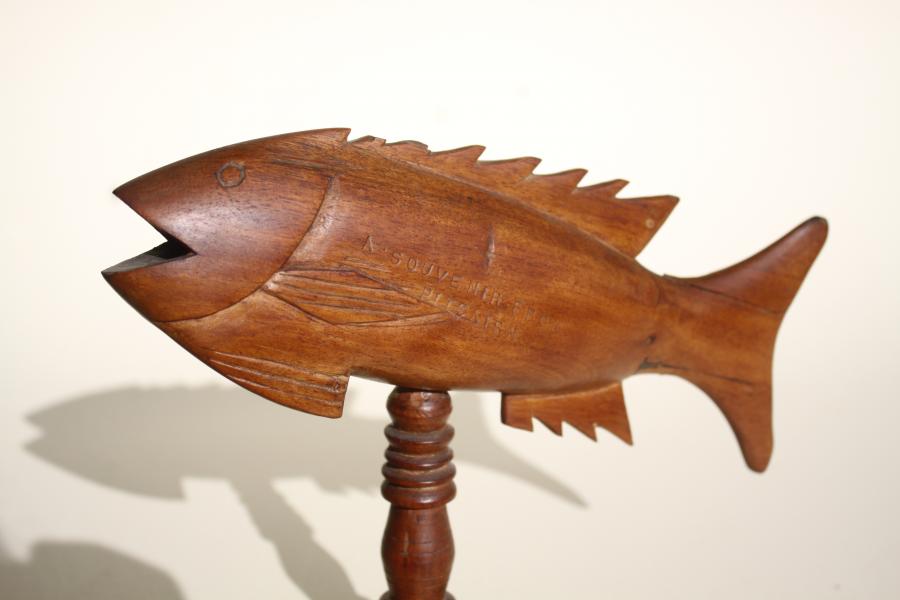 Good condition for an antique hand carved wood item. Note old repair to tail fins and what may be damage to first two top spikes of upper fin..