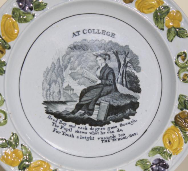 A wonderful early 19th century child's plate depicting a University student seated reading the latest paper. In the background the sun rises (A new bright start) over a classical building.