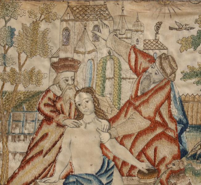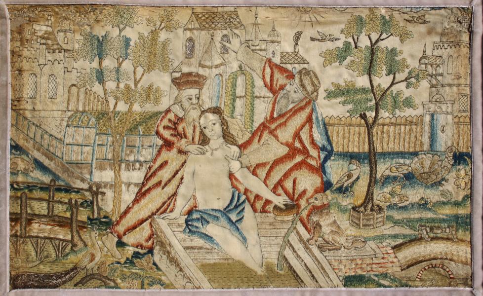 Susanna and the Elders, is a narrative included in the Book of Daniel.A fair Hebrew wife named Susanna was falsely accused by lecherous voyeurs the elders. As she bathes in her garden, having sent her attendants away, two elders, having previously said goodbye to each other, bump into each other again when they spy on her bathing. The two men realize they both lust for Susanna. When she makes her way back to her house, they accost her, demanding she have sex with them. When she refuses, they have her arrested, claiming that the reason she sent her maids away was to be alone as she was having sex with a young man under a tree