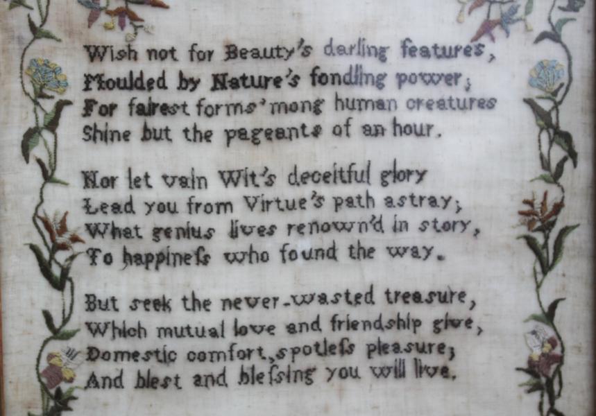 A GEORGE IV NEEDLEWORK CHIPPING CAMPDEN SCHOOL SAMPLER BY MARY DRURY, worked with coloured silks on a fine gauze ground, with a virtuous text within a freehand meandering flower border, signed and dated 'Mary Drury aged ten years Campden School 1822', in a later glazed bird's eye maple frame. 32 x 37 cm
