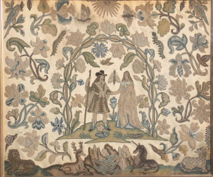 worked with various stitches and techniques and appliqued onto a satin weave cream silk, depicting Charles II and Catherine of Braganza holding hands under a flower entwined arbour, with a caterpillar, a butterfly and a bird, with further flowers and insects, above a rocky lake flanked by a recumbent stag, unicorn, lion and leopard.