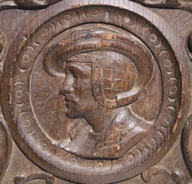 An unusual mid 16th century Romayne panel depicting a central roundel with a portrait of a gentleman in contempory dress hat. Above this an Angel is flying.