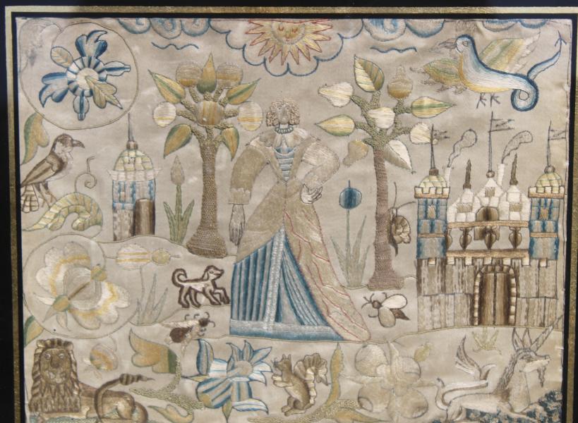 A good mid 17th century silk needlework depicting a central female figure walking out with her dog, from her large castle like palace on the left. She is depicted surrounded by flora and mystical beasts including a unicorn and wyvern and more common animals such as a Lion and squirrel.