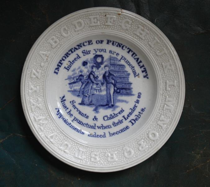 Mid 19th century Childs plate that we have not seen before. Molded Alphabet border and central print IMPORTANCE OF PUNCTUALITY.