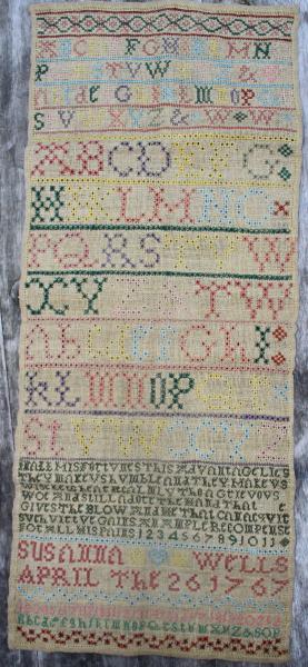A wonderful mid 18th century band sampler by Susanna Wells finished April 26 1767. Decorated with verse, alphabets, numbers and motifs, 52cm x 21cm in totally original, never been framed condition.