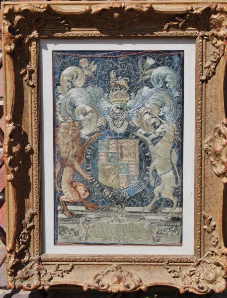An exceptional piece of mid 17th century needlework. The Royal coat of Arms of Charles II. Taken from an engraving by Wenceslaus Hollands Royal Arms which face Thomas Loggan's frontpiece to the Prayer Book of 1662, although used earlier in Cambridge in 1661.