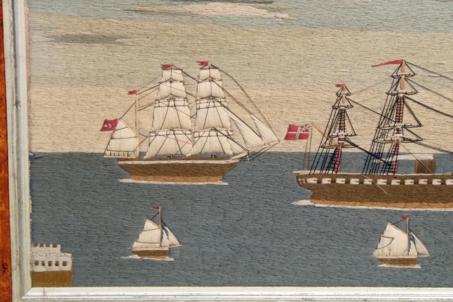 A good 19th century sailors needlework picture depicting a number of ships off Portsmouth, including a French boat.