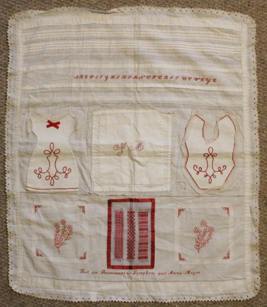 An interesting and unusual late 19th century School sampler by Anna Meyer , "Made at the Boarding School Gyseghem" .