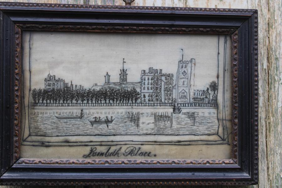 Often called "Hairworks" but in fact worked in black silk , copying contempory engravings of the time. in this case An elegant eighteenth-century print of Lambeth Palace from the river. Engraved by Joseph Collyer and originally produced for John Noorthouck’s “A New History of London” (London : 1773).