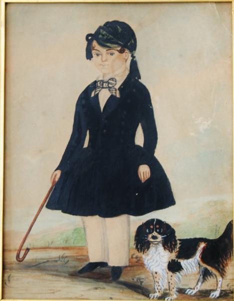 A charming early 19th century water colour depicting a young boy, taking his pet spaniel for a walk.