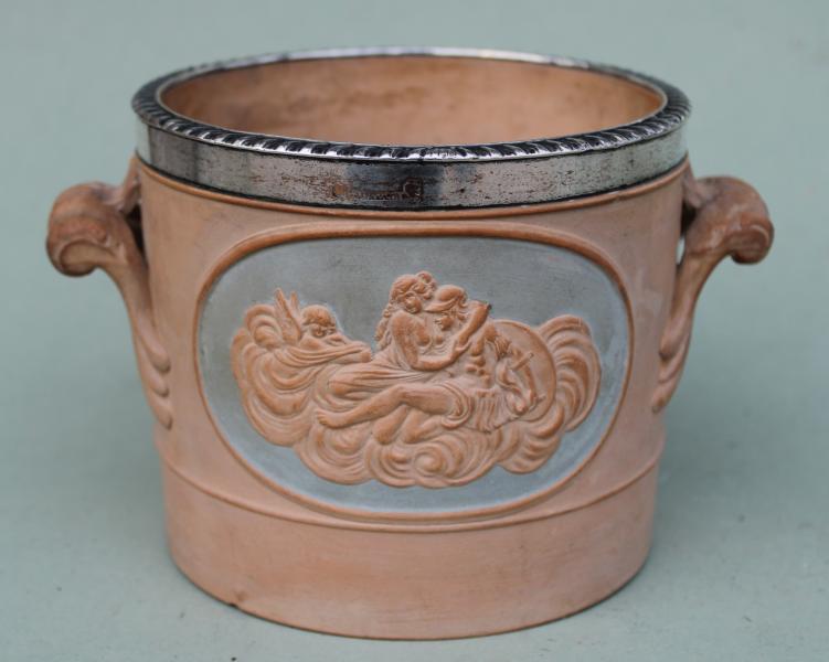 The "old Sheffield plate" rim , by Robert Gainsford ( his mark clearly placed central above the classical vignette) an integral part of the design protecting the pot from chipping against the harder wine decanter.