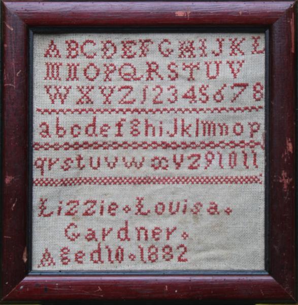 A delightful small Red & White School room sampler by Lizzie Louisa Gardner Aged 10 in 1882.