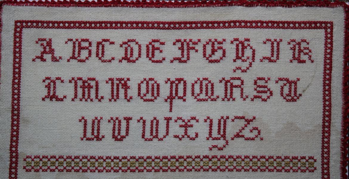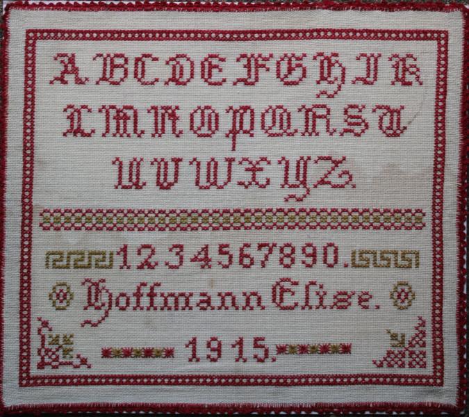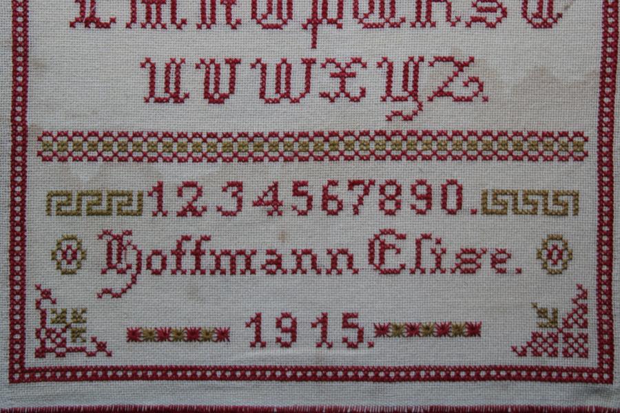 A striking early 20th century German sampler worked in the traditional style of alphabet followed by numbers with the sewers details Elise Hoffmann and date 1915 following .