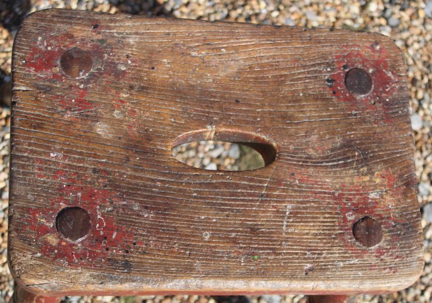 One of the best stools we have ever had. Great height, 18 inches ideal for next to the sofa, with the stability of its industrial heritage , it bears the owners / workshop brand C.I.A. / I.F that we have been unable to trace. The original paint red over yellow has been worn through to its oak carcass , used but not abused gives it a country / folk art vibe. |