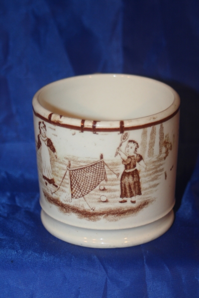 Rare late 19th century alphabet mug with the latters G H & I with a brown transfer print of ywo girls playing Tennis. A rare subject on pottery.