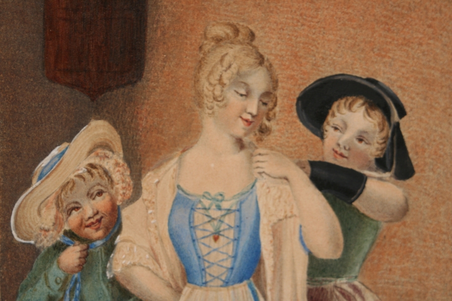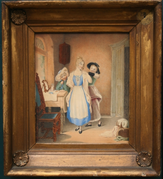 I do not know the origin of this delightful early 19th century water colour, Northern Europe, possibly Flemish from the style of the furniture. retaining its original giltwood frame this charming early 19th century water colour depicts a young woman getting dressed with her maids. I think although very well painted it retains a certain charm.