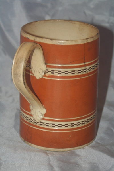 Although extensively damaged this slip decorated Mocha type mug has great appeal. The deep almost orange colour is unusual and very striking, as is the dramatic effect with the two diced engine turned bands . The handle has simple folate terminals.It is produced in creamware rather than a pearlware earthenware so probably dates to the 1790s. Height 6 inch, 5.3cm. Diameter 4 inch, 10cm Condition. Grubby, Large crack runs down the side of the handle to the base and then joins another that runs partly around the footrim. Some staining on the base. Another crack runs down the side, branches into two . Total lengths 3 1/2 & 2 inch. There is a crack between the branches. Small chip on rim , another in the crack on the footrim. |