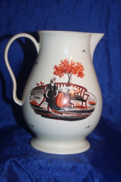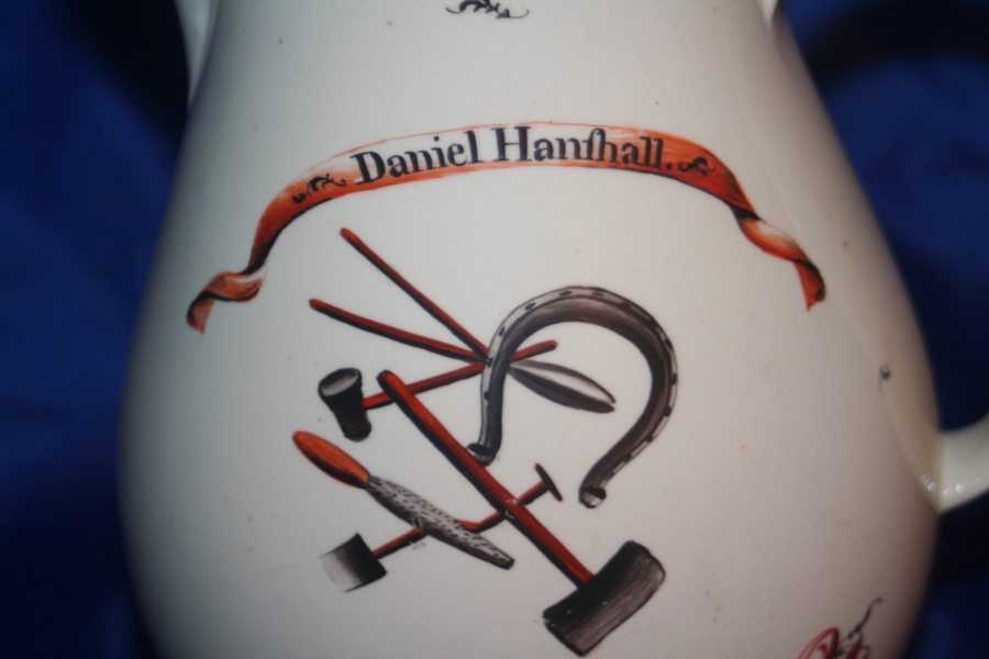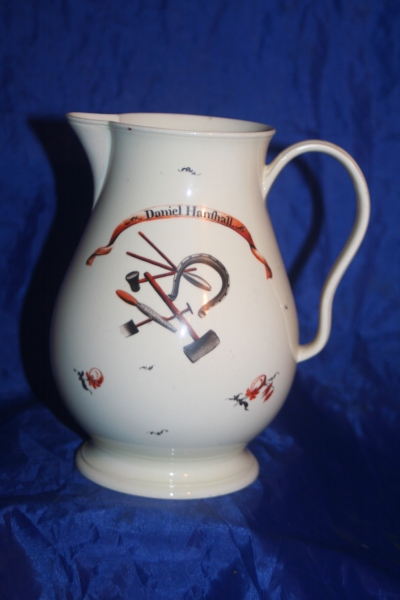 A splendid 18th century creamware jug in the manor of the Rhodes workshop. On one side a young lady is Sean seated at a table with teapot ect laid out. The other with Blacksmith implements below a ribbon with the name Daniel Hanshall.
