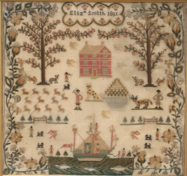 An exceptional silk sampler that has everything House boat fish animals and farmers all worked in a very fine and unusual floral border.