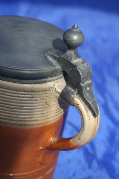 A rare 18th Century Saltglaze Stoneware Tankard or STIEN as I think it would preferred to be called. The banded form a standard style in northern Europe including England is decorated with a white slip around the top bands. I believe this may be German or one of the low countries like Belgium or Holland