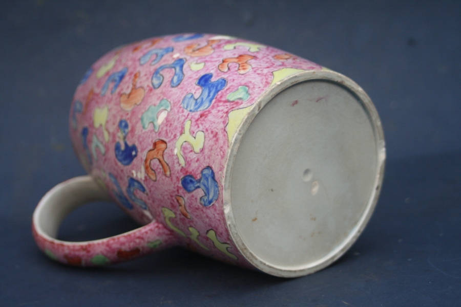 A very rare and unusual 18th Century pearlware tankard decorated in over glaze enamels very much in a saltglaze style. This same style of decoration with a shaped panel is recorded in Creamware & Pearlware Re-examined by Tom Walfod page 110 on a teapot dated 1784 he attributes to the North East England. I also remember a coffee pot again dated in the mid 1780s sold at Sotheby's with the same style of decoration.