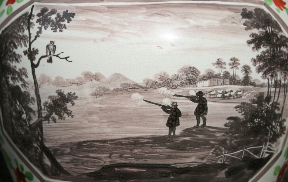 This is a unique and impressive jug standing 24 cm tall at the spout, hand painted with a verse about shooting owls.Restored chip to spout, well done.