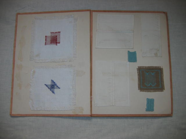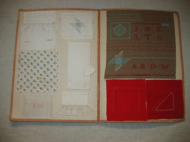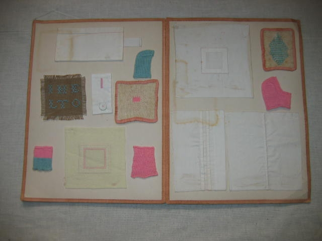 Circa 1900, Six full pages stiff card full of needlework , all the range of stitch work represented including darning work and button hole work. Wonderful single knitted mitten. Front board water coloured with flowers.