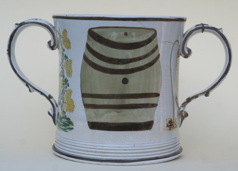 A Yorkshire Double-Handled Eshaldwell Brewery Pearlware Pottery Mug, 1829, probably Swillington Bridge Pottery near Leeds, the cylindrical body printed and painted on one side with beer barrel, fruiting hops and a barley ear, on the other with four line verse ESHALDWELL BREWERY, IS KNOWN VERY WELL/FOR BREWING GOOD ALE NONE CAN IT EXCEL/PAY OFF YOUR OLD SCORES AND ORDER AGAIN/FOR I'M SURE OF THE ALE YOU CANNOT COMPLAIN, 1829, within floral sprays, with brown line detail and moulded basal horizontal ribbed band, 19cm high, 33.5cm wide across handles Mugs and beer jugs of this type are known and presumably come from the Woodlesford area in Yorkshire. It is probably that Bentley Eshaldwell Brewery in Aberford Road, Woodlesford, founded 1828, commissioned these vessels for advertising purposes and promoting the Brewery's ales. This brewery was absorbed by Whitbread Breweries in 1968, and was subsequently closed in 1972. |