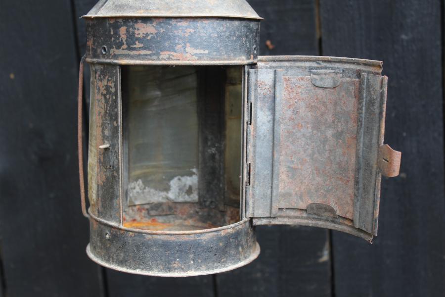A some what strange horn lantern in that the door window appear to have always been a sheet of metal, possibly silvered to reflect the light.