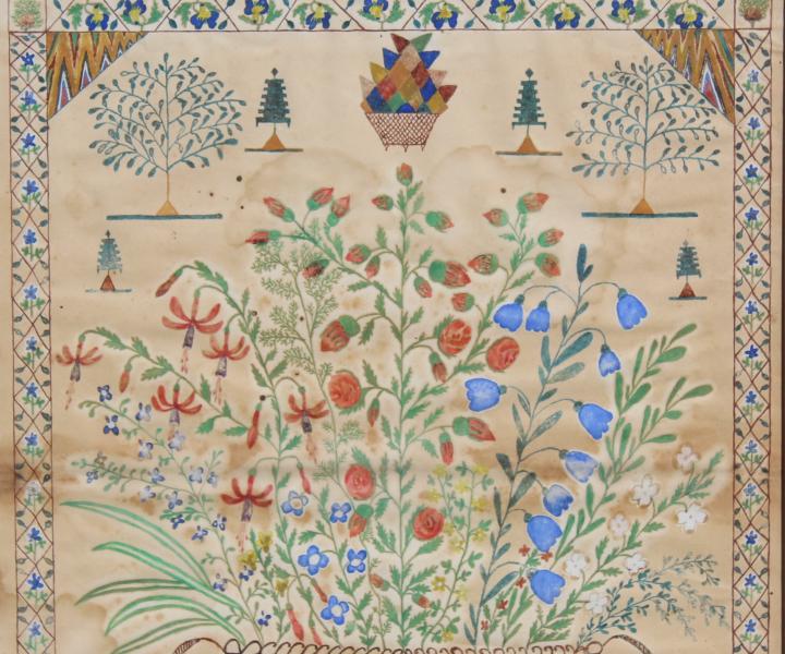 A wonderful and large water colour on tick paper depicting "A BASKET of FLOWERS". Signed and dated ANN PIMLOTT 1965.