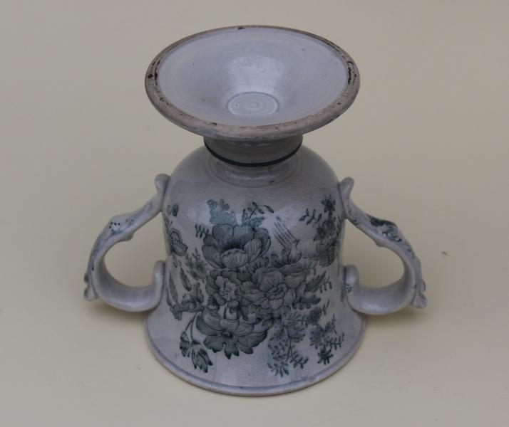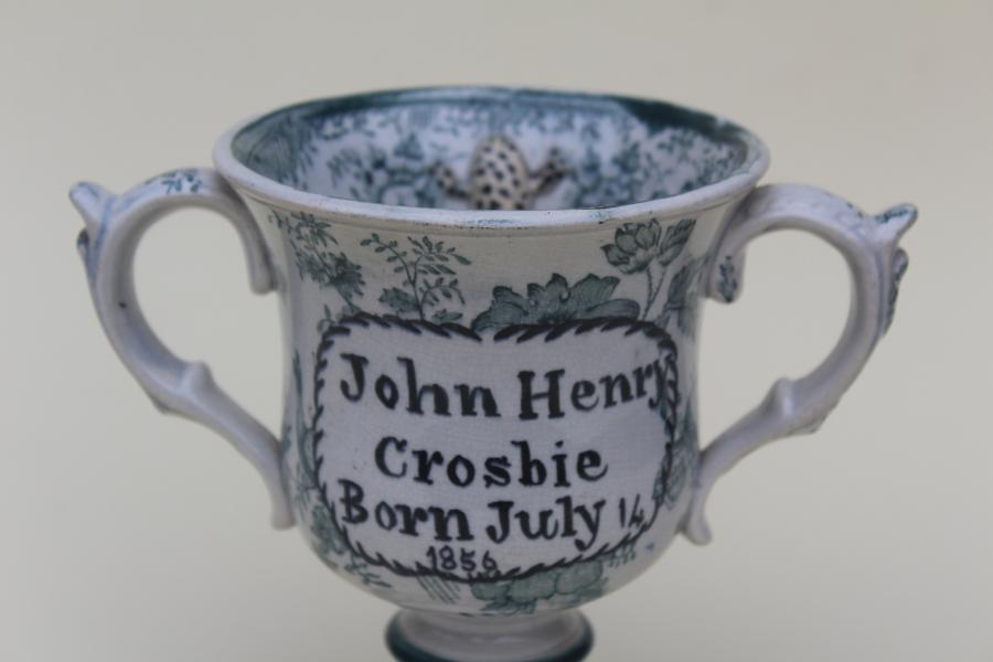 Oh what a delightful story this mug can tell. made to commemorate the birth of John Henry on July 14 1856 . Transfer printed in green with three frogs moulded on the inside.