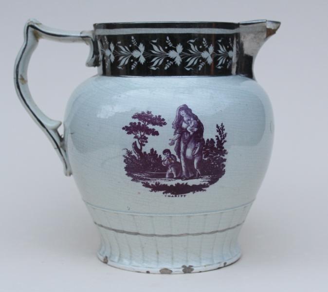 Now in 1810 Manchester was the center of the textile industry and, in that year there was considerable tension between the mill owners and spinners that resulted in the great Strike the following year. The jug shows a gentleman handing over a pledge to the seated worker , who is looking up his name on a list ! , in the background we have framed images of the Hatters, Glove makers, Wool merchants and the rabbit possibly representing the farriers ?. I think this jug is showing, to those in the know, that the trades are united , against the Mill owners. The other side as an image of Charity , they could all drink to her .