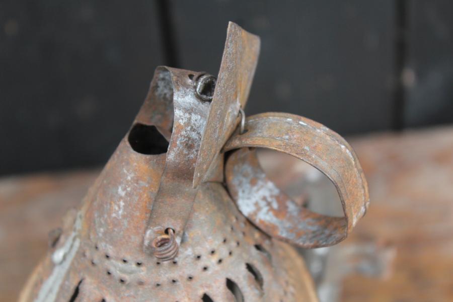 A mid 19th Century Tin / sheet iron candle lantern with three windows, pierced conical top and carrying loop handle.