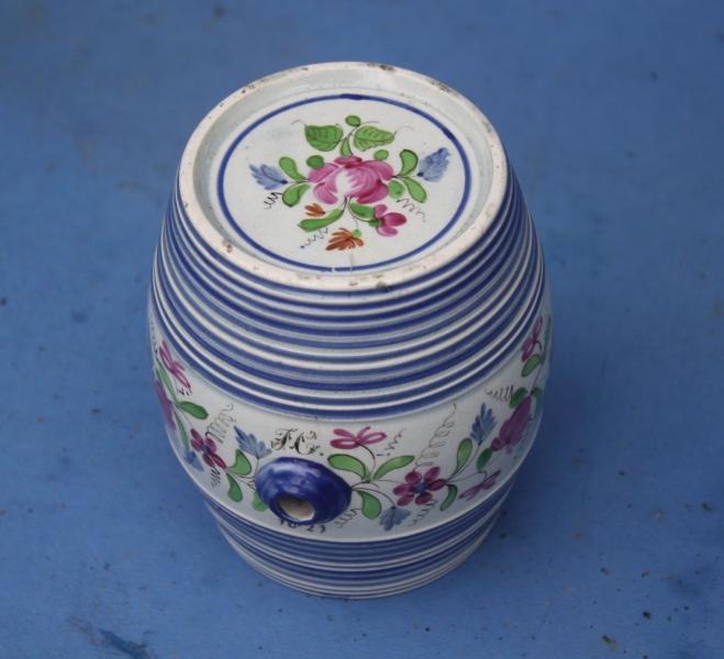 A very rare and unusual Bristol Barrel decorated in a blue pallet with a typical band of flowers again in an unusual colour combination.