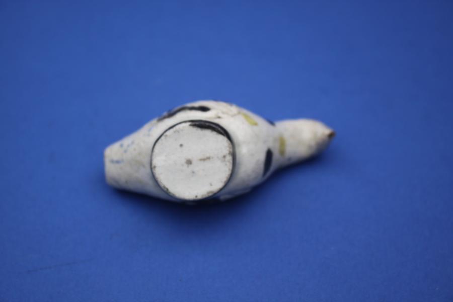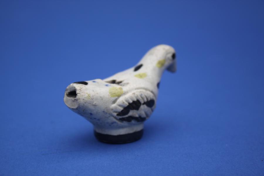 A rare early 19th century pearlware bird whistle decorated in Pratt like colours.