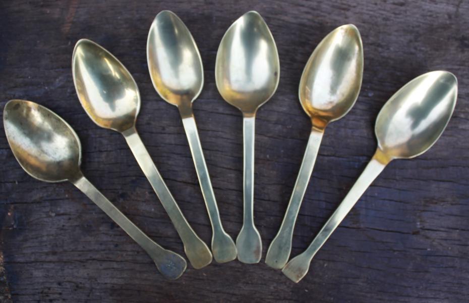 Not born with a silver spoon, then brass will have to do !. A matched set of six 18th / early 19th century French Breton Spoons, one with makers mark,