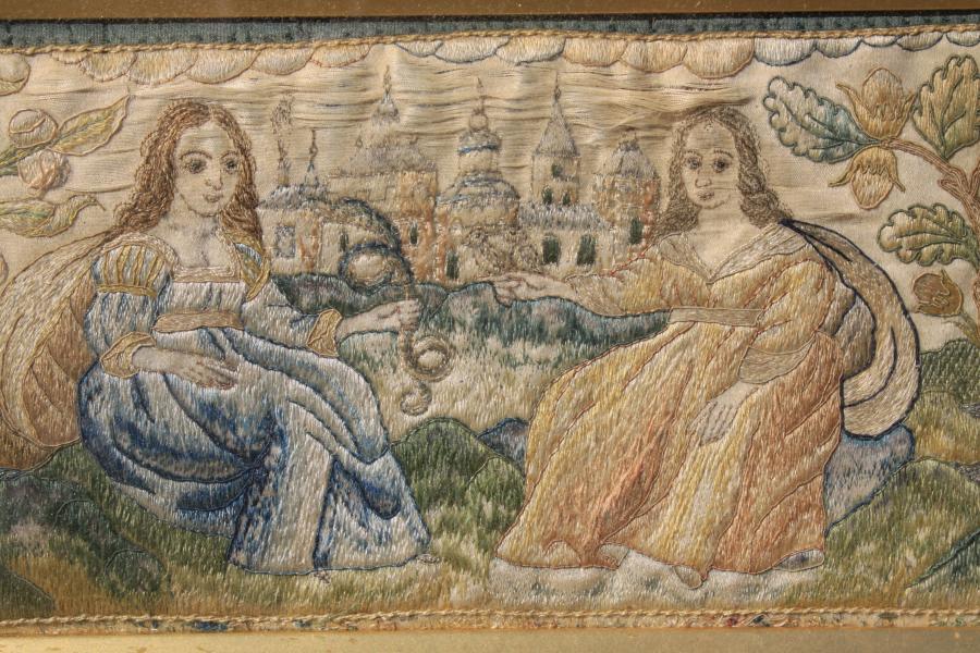 A delightful and charming 17th century silk panel, depicting two female figures one holding a snake the other a bird. Possibly representing good & evil. Probably originally from casket or box.