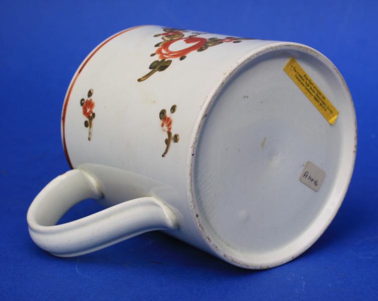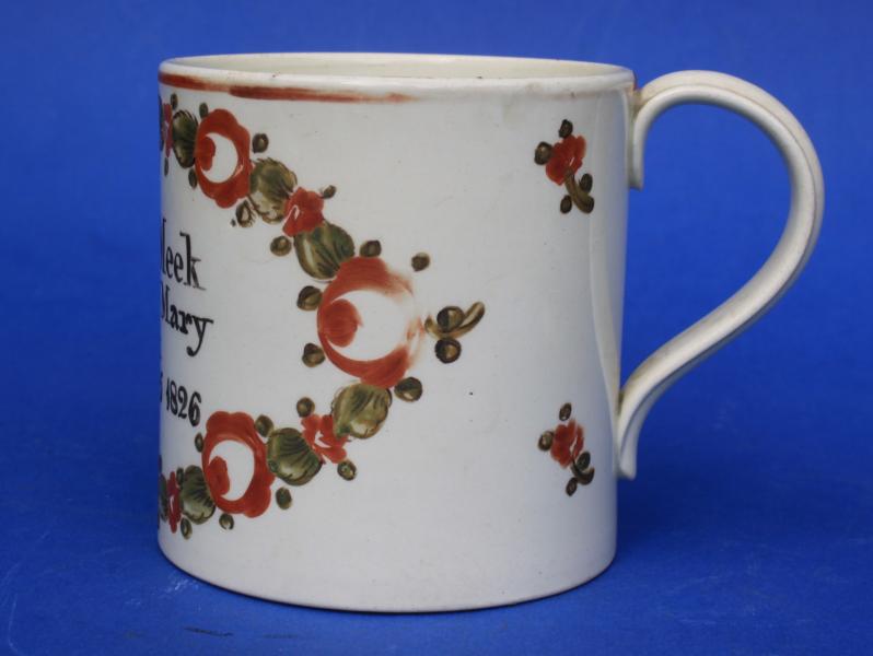 A SUNDERLAND CREAMWARE MUG ATTRIBUTED TO PHILLIPS' NORTH HYLTON POTTERY, DATED 1826 with red and overglaze painted stylised floral decoration and inscribed in black Thomas Meek son of Michael & Mary Meek born Octr 25 1826, 10cm.