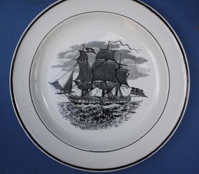 A group of three patterns depicting sailing ships by an unknown maker. Each central scene is titled at its base and is printed with simple black-lining on the rims of plates. All recorded examples are unmarked and the only colour known is black, although a few examples have the design highlighted in colour.