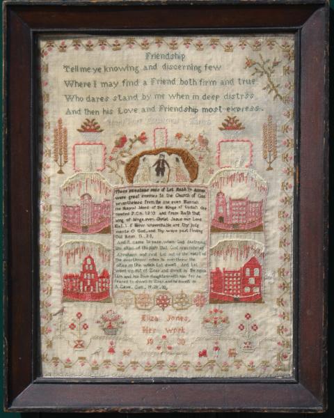 Remember Lots wife , is the title of this very unusual probably Welsh sampler, by Eliza Jones in 1830.