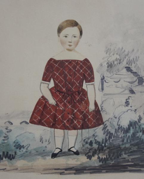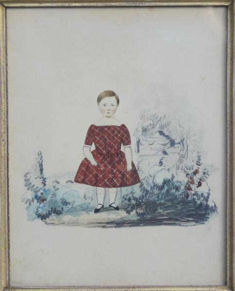 A typically charming 19th century primitive naïve water colour of a young girl, standing next to a classical urn.