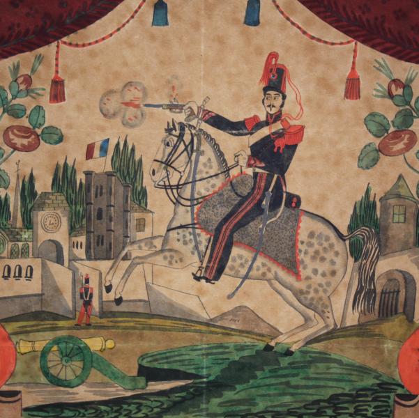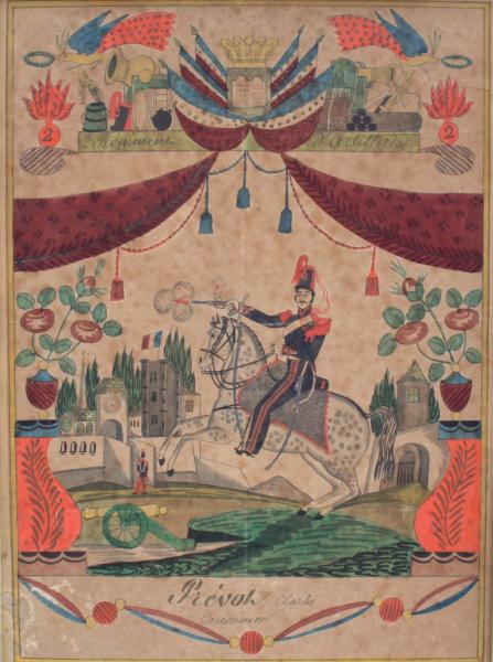 Pen & Ink with water colour. He is seen on his dapple grey mount firing a flintlock pistol surrounded by the trophies of war. |