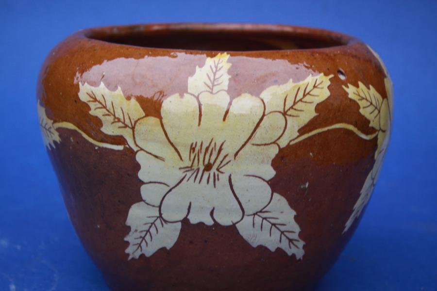 A rare and unusual late 19th century Slipware Jardinière decorated with a repeated pattern of flower heads in cream slip against a red / brown ground.