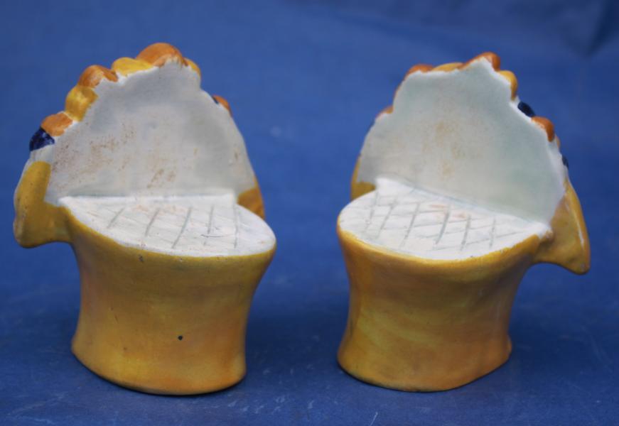 A wonderful pair of early 19th century Staffordshire Window stops. Formed as urns of summer fruits and decorated in pratt colours.