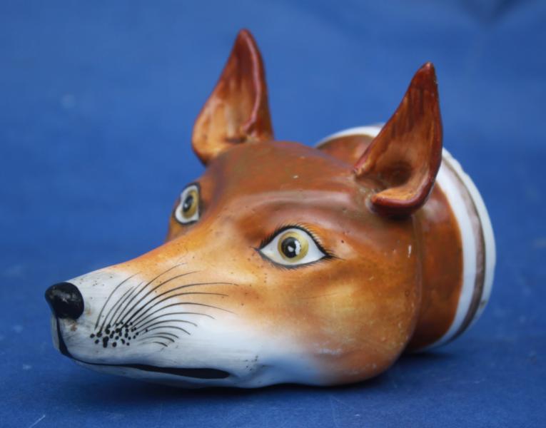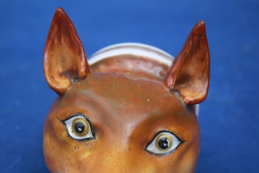 A good Staffordshire porcelain Fox Head stirrup cup, decorated in naturalistic colours in over gaze enamels.