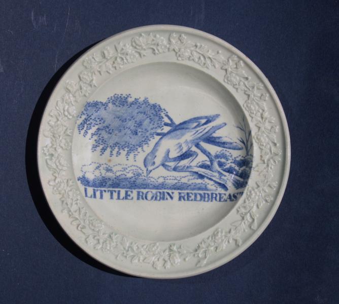 Wonderful small child's plate printed in blue with a titled print LITTLE ROBIN REDBREST.