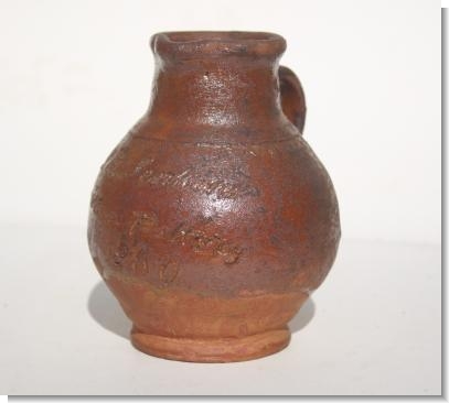 small jug, of the form produced in Devon at Honiton from the 17th to the late 19th century. This inscribed J.M.Jenkins , Honiton pottery 1869.